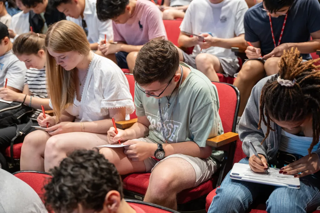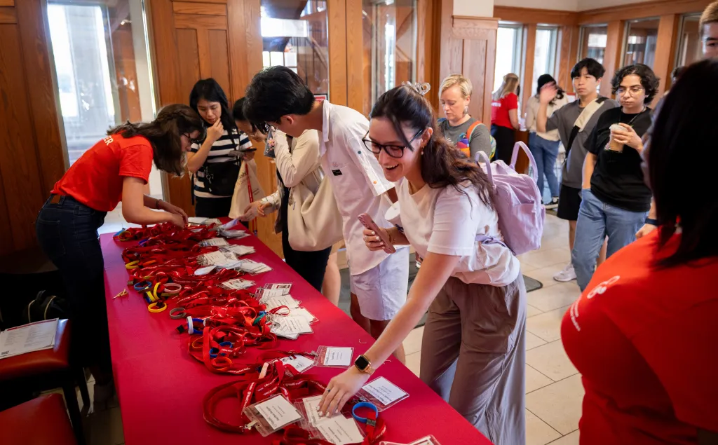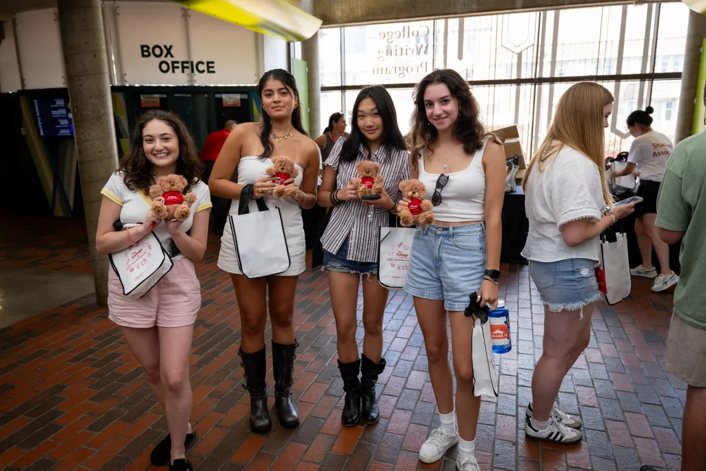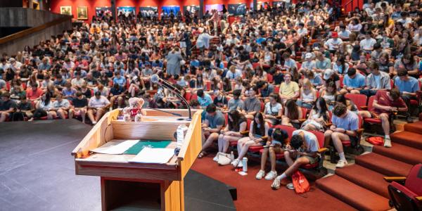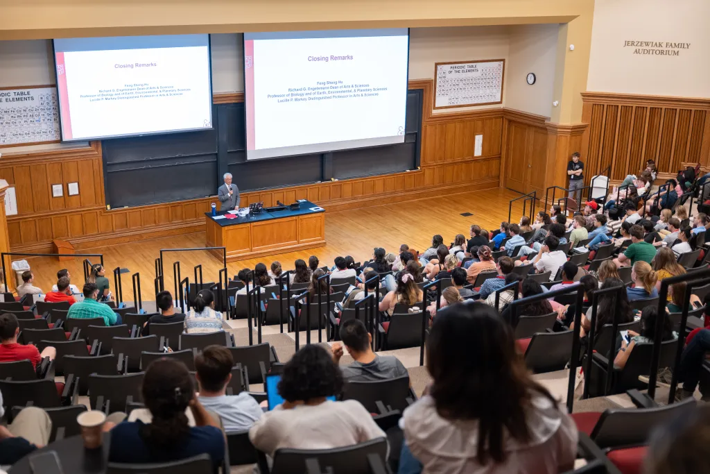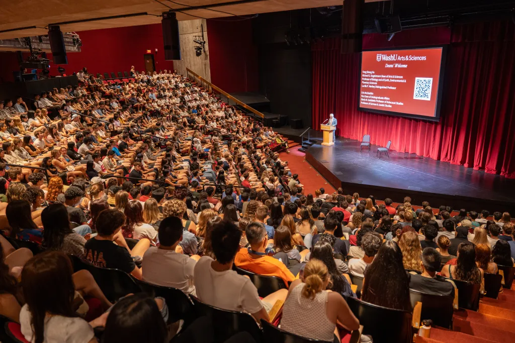 On Monday, Aug. 19, nearly 1,200 incoming undergraduates gathered in Edison Theatre to kick off their first year in the College of Arts & Sciences with remarks from Feng Sheng Hu, the Richard G. Engelsmann Dean of Arts & Sciences, and Erin McGlothlin, vice dean of undergraduate affairs. Students received a small stuffed bear with an enamel pin commemorating their participation in orientation before writing postcards to their future selves.