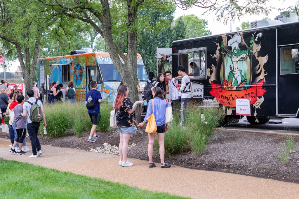 Also on Monday, nearly 300 incoming graduate students gathered in Tisch Commons to learn about graduate student organizations before moving to Wrighton Hall for an introduction to life as a graduate student in Arts & Sciences. They then headed to Olympian Way for lunch from local food trucks and a “Gradventure” activity designed to help them get familiar with campus buildings and resources. Programming continued in Wrighton Hall on Tuesday with presentations on career and professional development, mentoring, financial literacy and more.