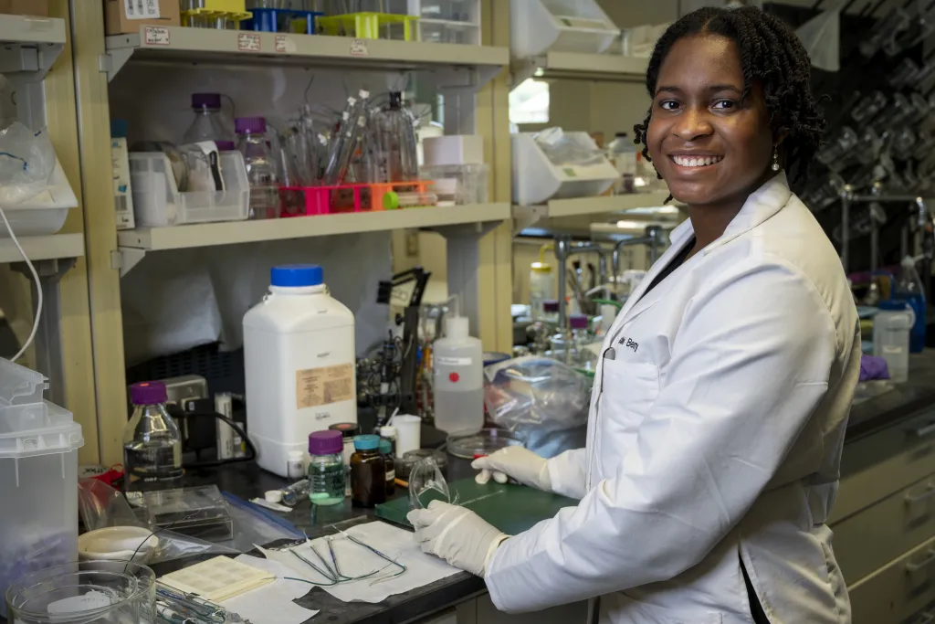 Ashlynn Berry, a doctoral student in the Department of Chemistry, thinks a lot about energy: How it’s produced, how it’s stored, and what it would take to make the world’s energy system sustainable. “Ever since high school, I’ve been interested in helping solve pollution and other environmental crises,” she said. “That means looking at energy.”