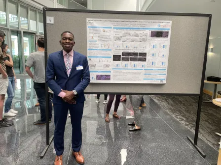 Oyetunji with his poster at the 2021 WUSTL ENDURE symposium. (Photo courtesy Ephraim Oyetunji)