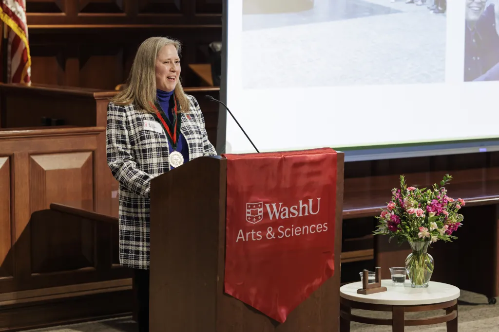 McGlothlin thanked her family, peers, and students for supporting her journey in scholarship and research. “I have been so fortunate over the course of my career to have been surrounded by a great many people who are inspiring, encouraging, resourceful, dedicated to deep scholarly inquiry and the careful education of students, ethically minded, and wicked smart,” she said. “My flourishing as a scholar, a teacher, a leader, and as a person is a testament to the mutually supportive community I have found in WashU over the last 23 and a half years.”