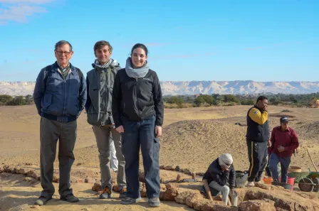 Left to right: Roger Bagnall (honorary professor of classics), Aravecchia (center), and Harper Tooch (graduate student) at Amheida during the 2023 excavation season. (Credit: Amheida Project)