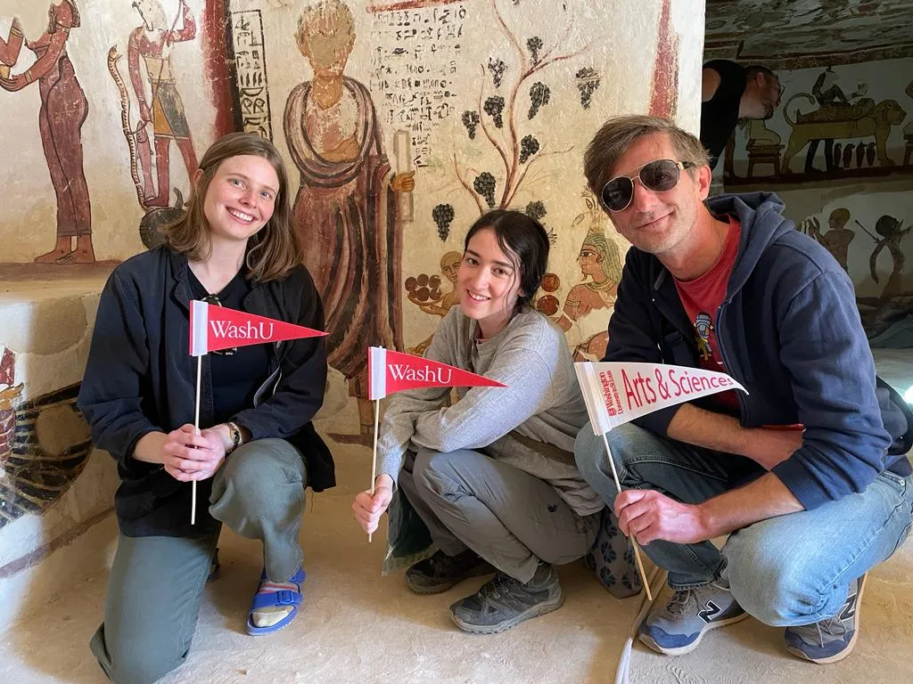 WashU graduate students Claire Lyman and Mary Sulavik with Aravecchia at a Roman-period site in Dakhla. (Credit: Amheida Project)