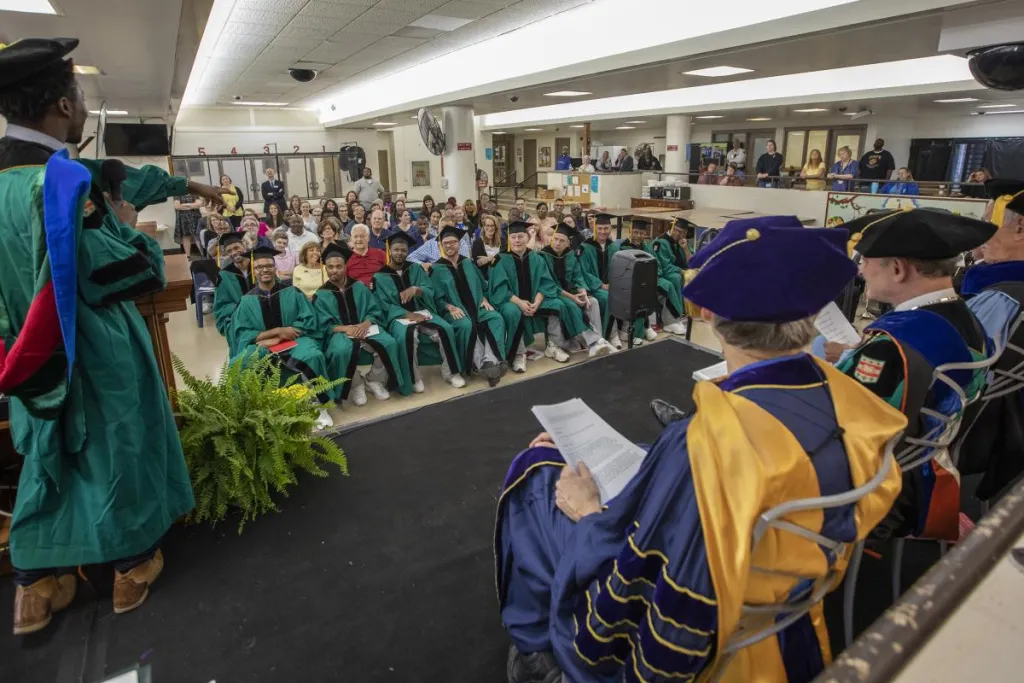 On May 22, the Washington University Prison Education Project (PEP) conducted its first Commencement at the Missouri Eastern Correctional Center in Pacific, Mo. Ten students earned associate’s degrees.
