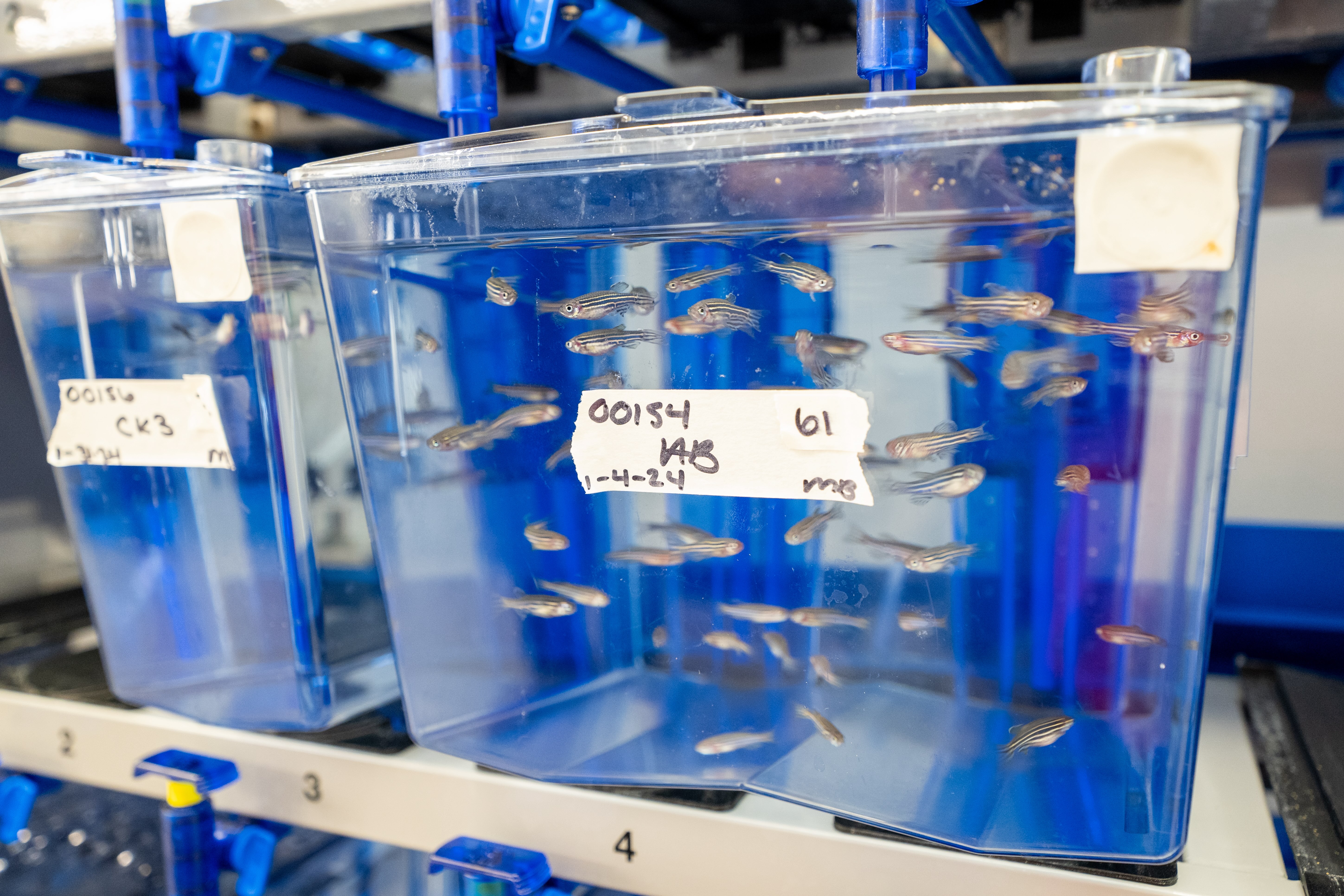 Downstairs from his lab of top-of-the-line mass spectrometry equipment, Patti keeps another lab featuring relatively low-tech fish tanks teeming with thousands of tiny, stripy zebrafish, another extension of his intense interest in the link between environmental exposures and disease. In his zebrafish lab, fish zip around in dozens of small tanks, where they live on precisely controlled diets. Fish in one tank feast on a high-fat diet while their neighbors in the next tank go lean. Other tanks are labeled “PFAS,” signifying these animals are getting dosed with forever chemicals. Look closely and you can see some fish are swimming around with small, dark tumors, a sign that their assigned diet and chemical exposures aren’t ideal for health.
