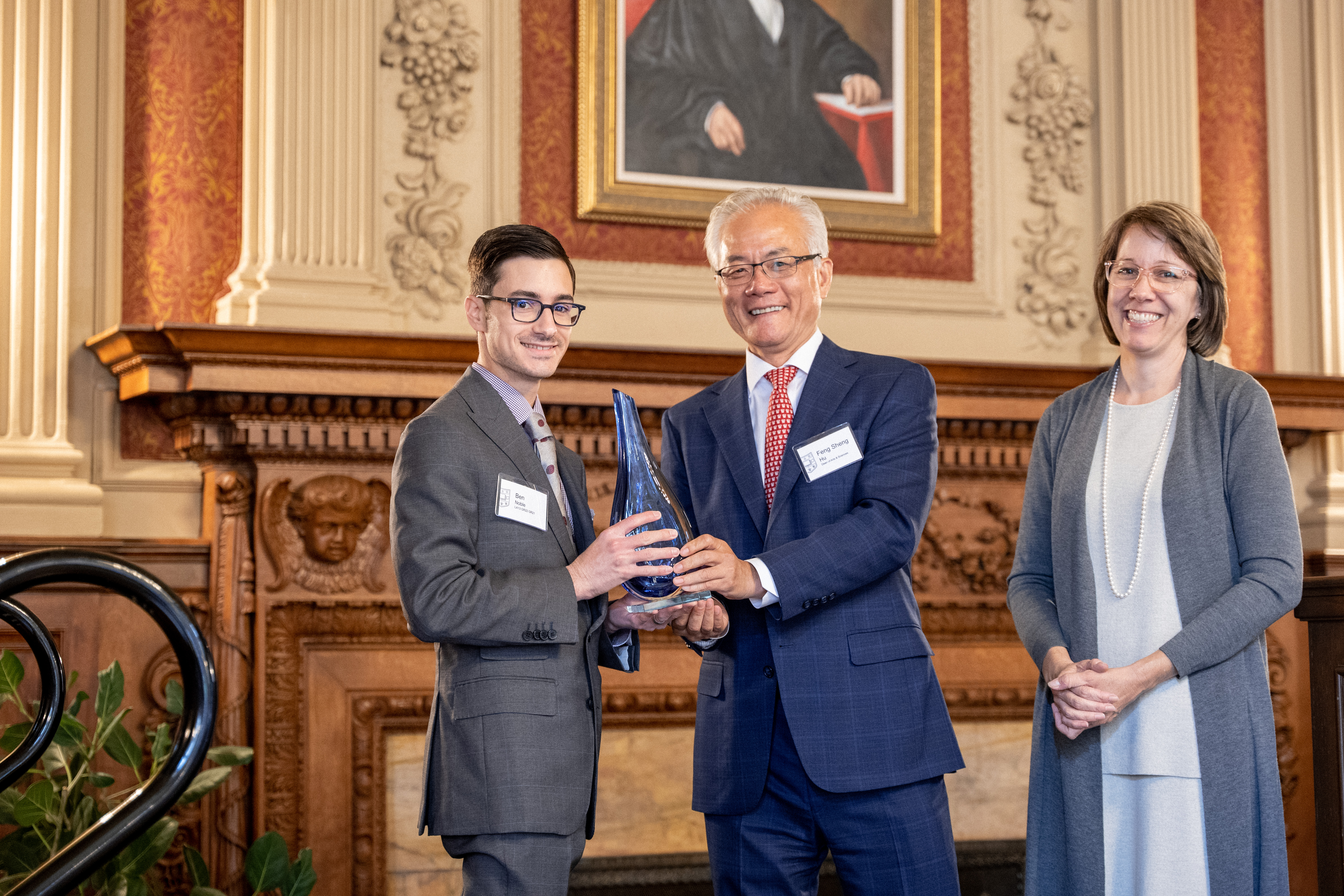 Graduate student Benjamin Noble (left) accepts the inaugural Dean's Award for Graduate Research Excellence from Dean Feng Sheng Hu and Vice Dean Sophia Hayes.
