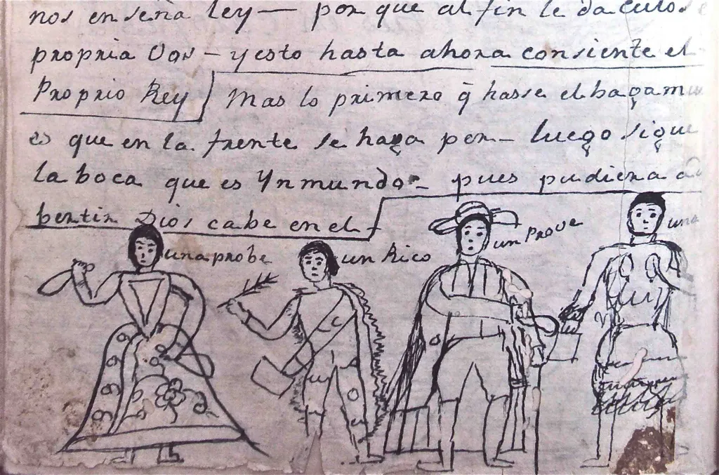 One subject of extended investigation, Jose Ventura Gonzalez, nicknamed Tebanillo, presented a case similar to many people suffering from mental illness in Mexico at the time. Gonzalez would frequently say things in public that on the surface were blasphemous. Inquisitors found a notebook in his house that contained both drawings for his occupation as an embroiderer alongside heretical and pornographic drawings.