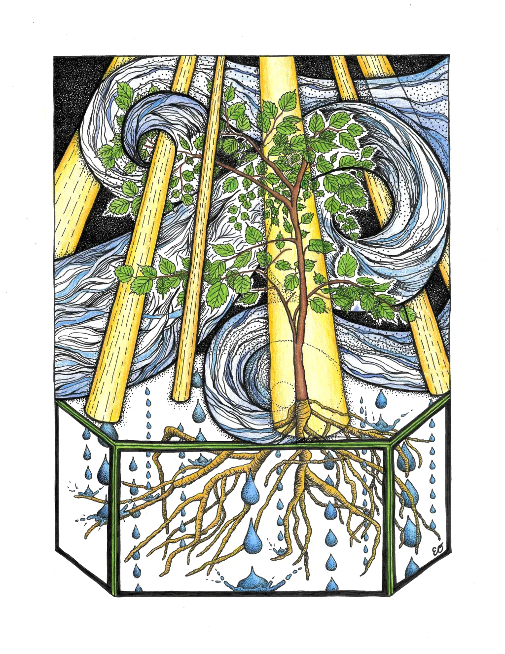 What does a plant eat for dinner? A healthy serving of thin air (carbon dioxide, represented by blue sweeping swirls) seasoned with nutrients and drizzled with sunlight (vertical yellow beams), and a tall glass of water (underground blue droplets) to wash it all down – or perhaps up.