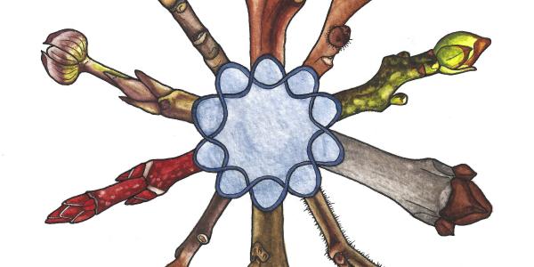 Ten of the most common species in the ForestGEO research plot at Tyson Research Center (clockwise from top center): Red oak (Quercus rubra), paw paw (Asimina triloba), sassafras (Sassafras albidum), white ash (Fraxinus americana), slippery elm (Ulmus rubra), shagbark hickory (Carya ovata), Carolina buckthorn (Frangula caroliniana), red maple (Acer rubrum) flowering dogwood (Cornus florida), and downy serviceberry (Amelanchier arborea).