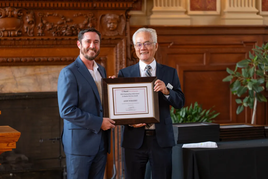 Andy Wiegert accepts the Outstanding Achievement in Student Services Award from Feng Sheng Hu, the Richard G. Engelsmann Dean of Arts & Sciences.