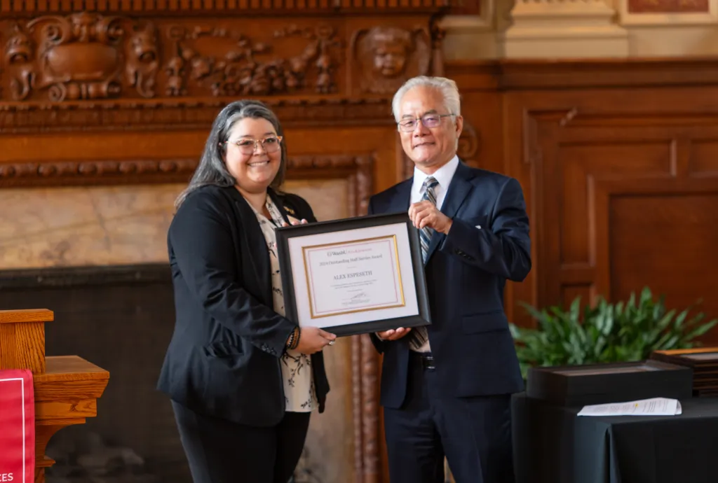 Alex Espeseth accepts her Staff Service Award from Feng Sheng Hu, the Richard G. Engelsmann Dean of Arts & Sciences.