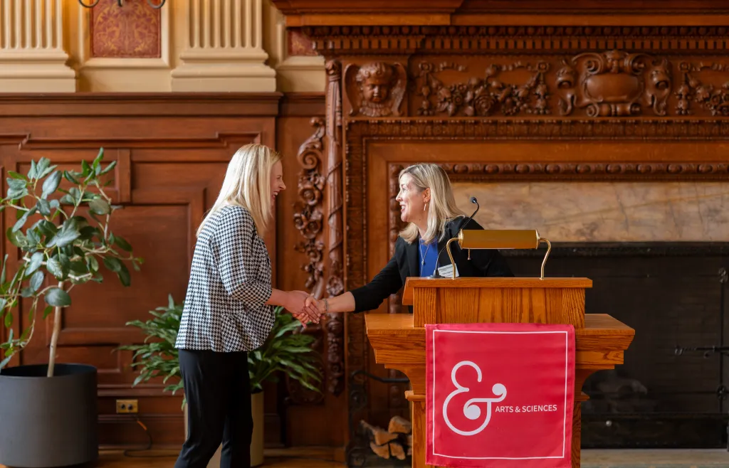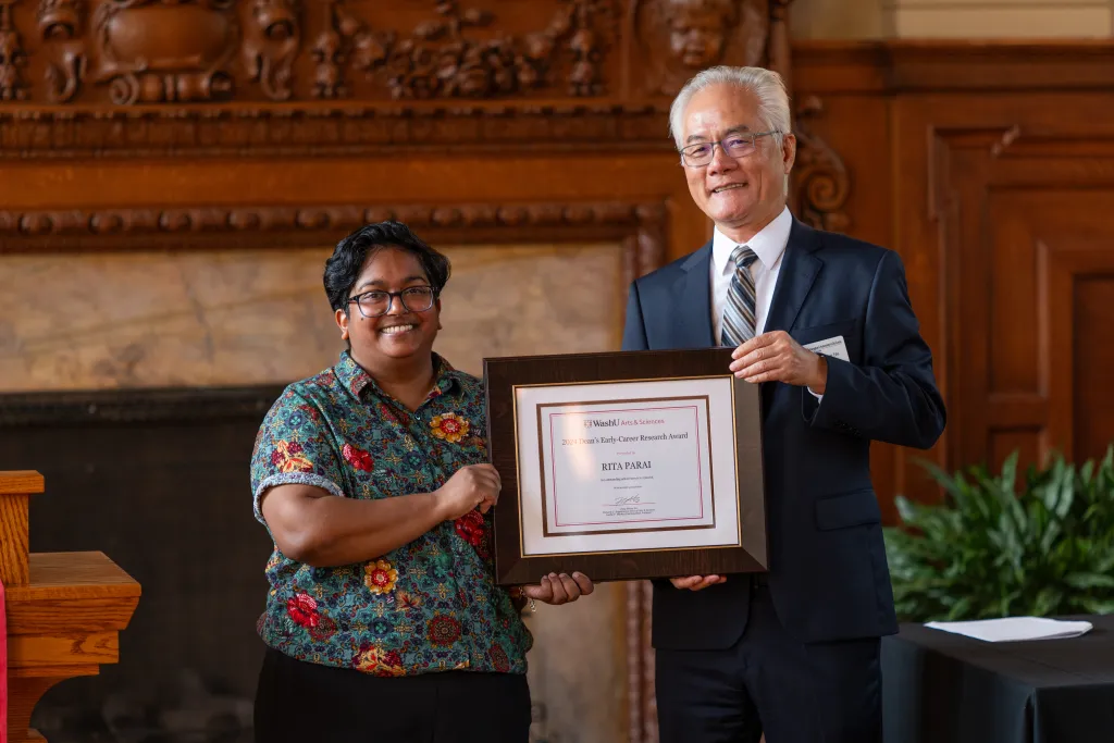 Rita Parai accepts the Dean's Early-Career Research Award from Feng Sheng Hu, the Richard G. Engelsmann Dean of Arts & Sciences.