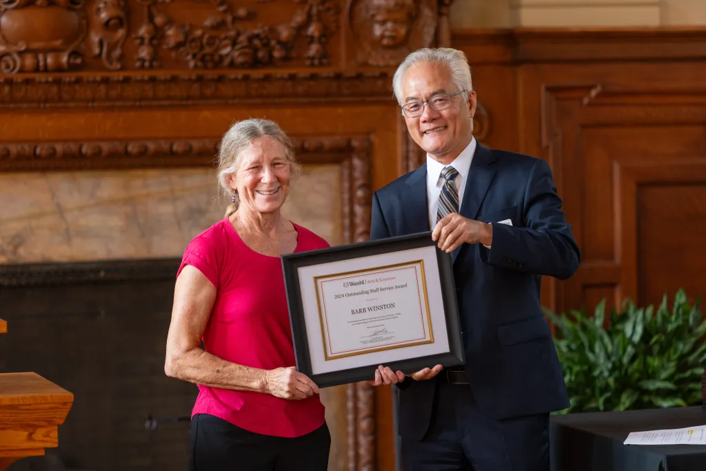 Barb Winston accepts her Staff Service Award from Feng Sheng Hu, the Richard G. Engelsmann Dean of Arts & Sciences.