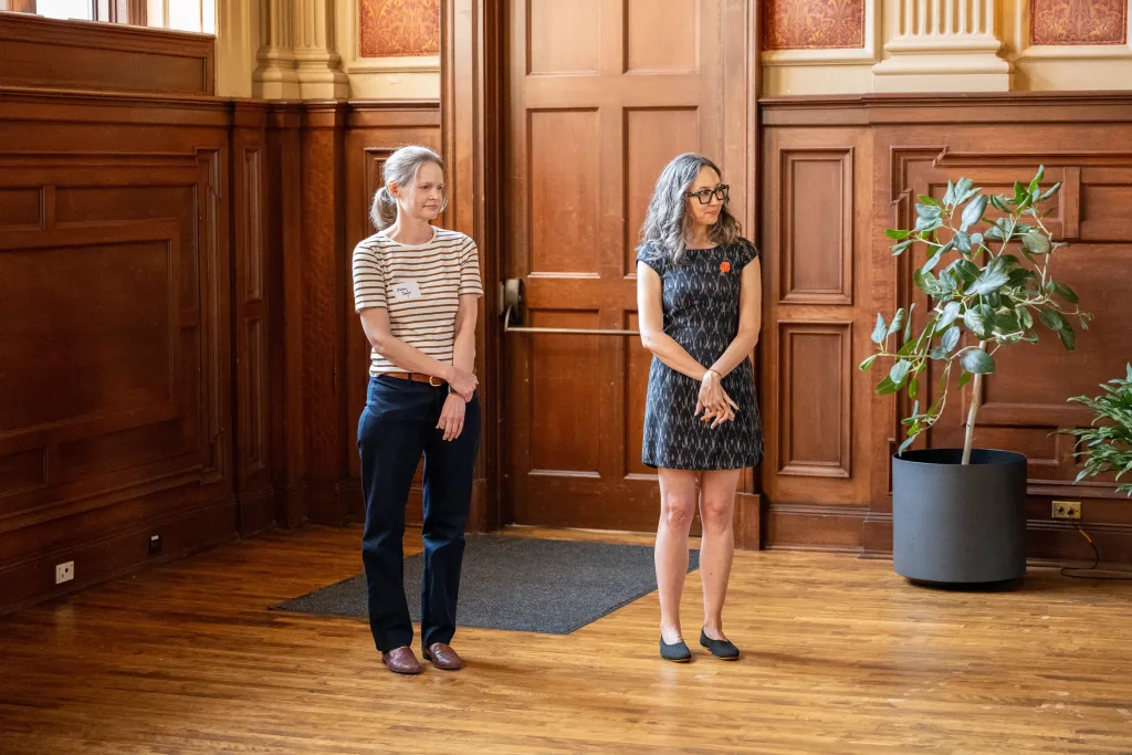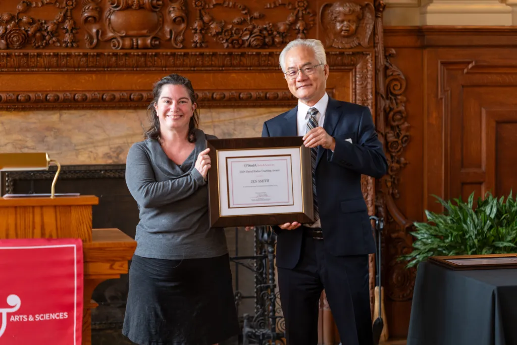 Jennifer Smith accepts the 2024 David Hadas Teaching Award from Feng Sheng Hu, the Richard G. Engelsmann Dean of Arts & Sciences.
