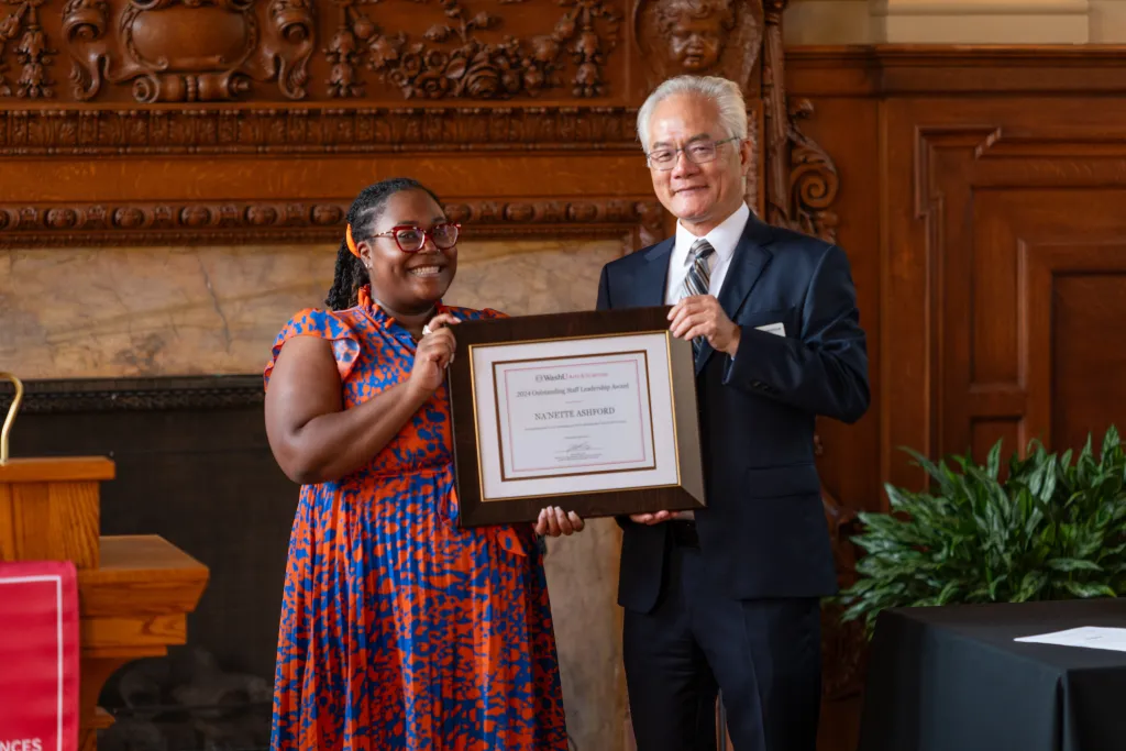 Na'Nette Ashford accepts the Staff Leadership Award from Feng Sheng Hu, the Richard G. Engelsmann Dean of Arts & Sciences.