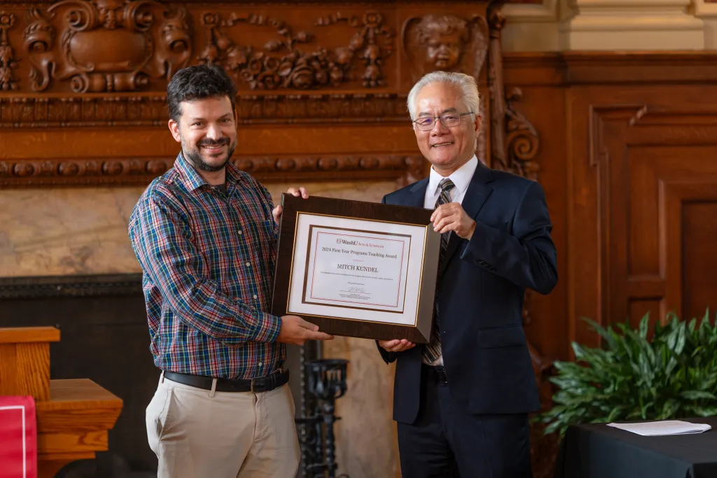 Mitchell Kundel accepts the First-Year Programs Teaching Award from Feng Sheng Hu, the Richard G. Engelsmann Dean of Arts & Sciences.