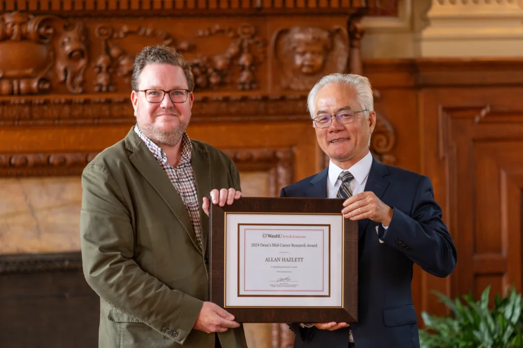 Allan Hazlett accepts the Dean's Mid-Career Research Award from Feng Sheng Hu, the Richard G. Engelsmann Dean of Arts & Sciences.
