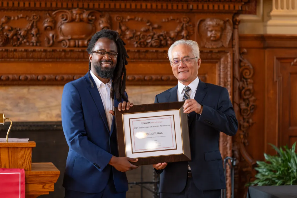 Douglas Flowe accepts the Dean's Award for Diversity Advancement from Feng Sheng Hu, the Richard G. Engelsmann Dean of Arts & Sciences.