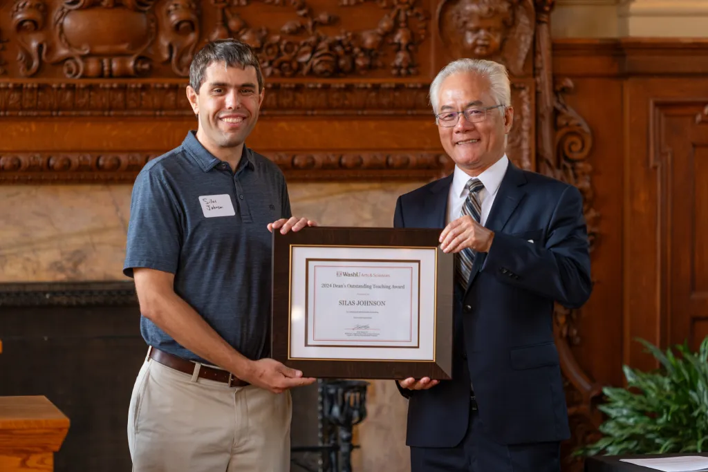 Silas Johnson accepts the Outstanding Teaching Award from Feng Sheng Hu, the Richard G. Engelsmann Dean of Arts & Sciences.