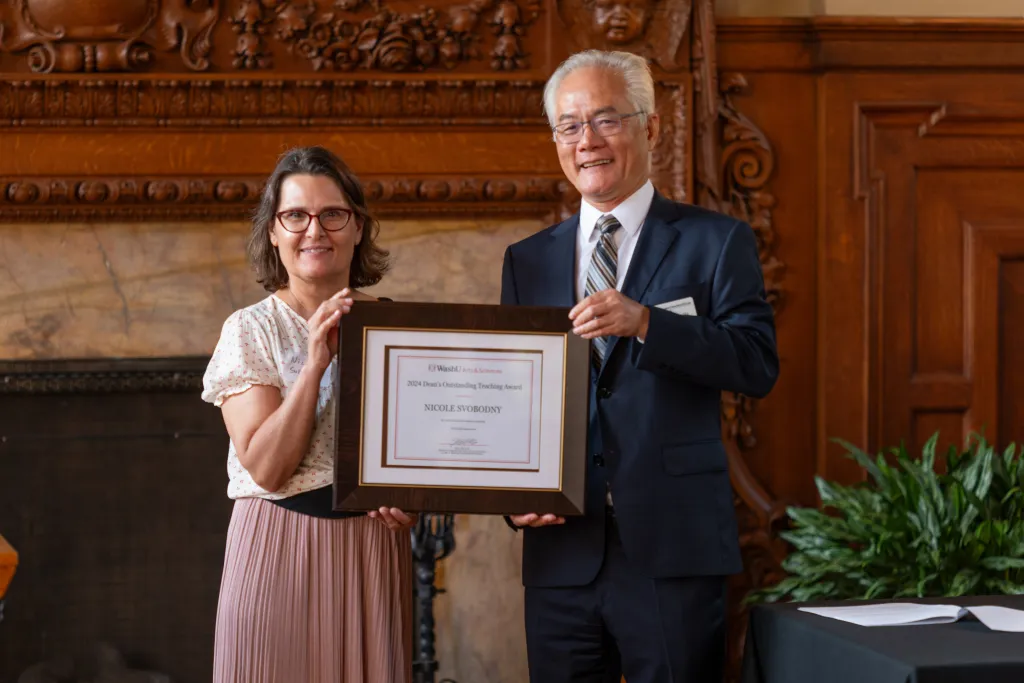 Nicole Svobodny accepts the Outstanding Teaching Award from Feng Sheng Hu, the Richard G. Engelsmann Dean of Arts & Sciences.