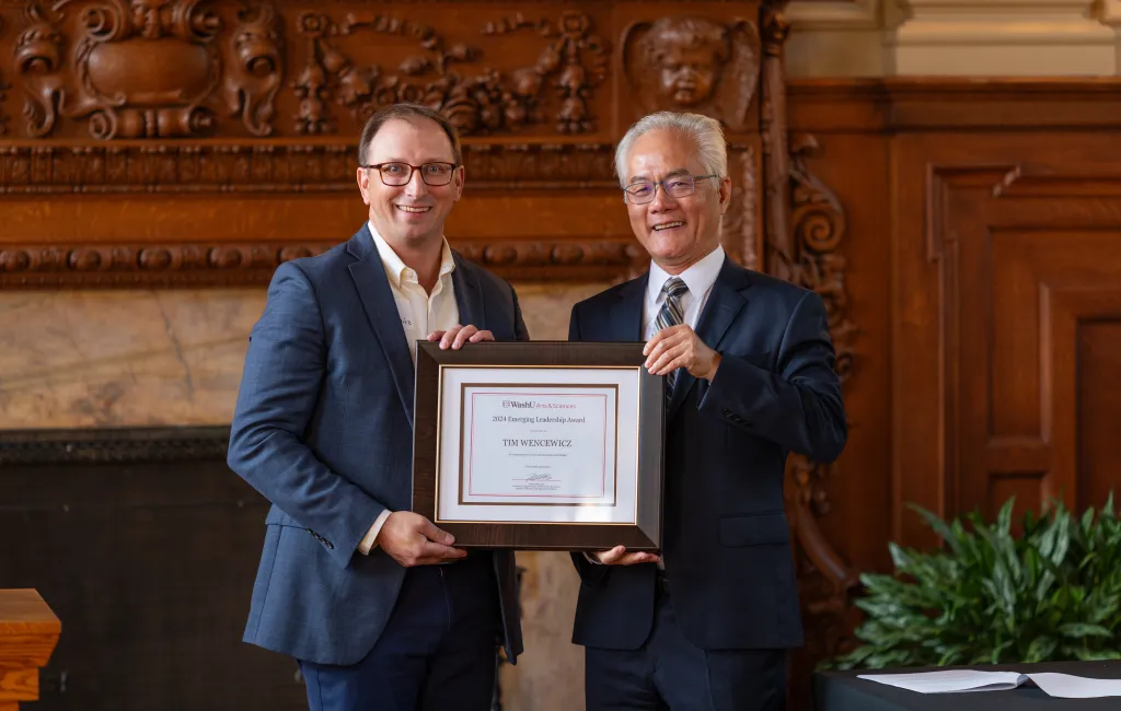 Tim Wencewicz accepts the inaugural Emerging Leadership Award from Feng Sheng Hu, the Richard G. Engelsmann Dean of Arts & Sciences.