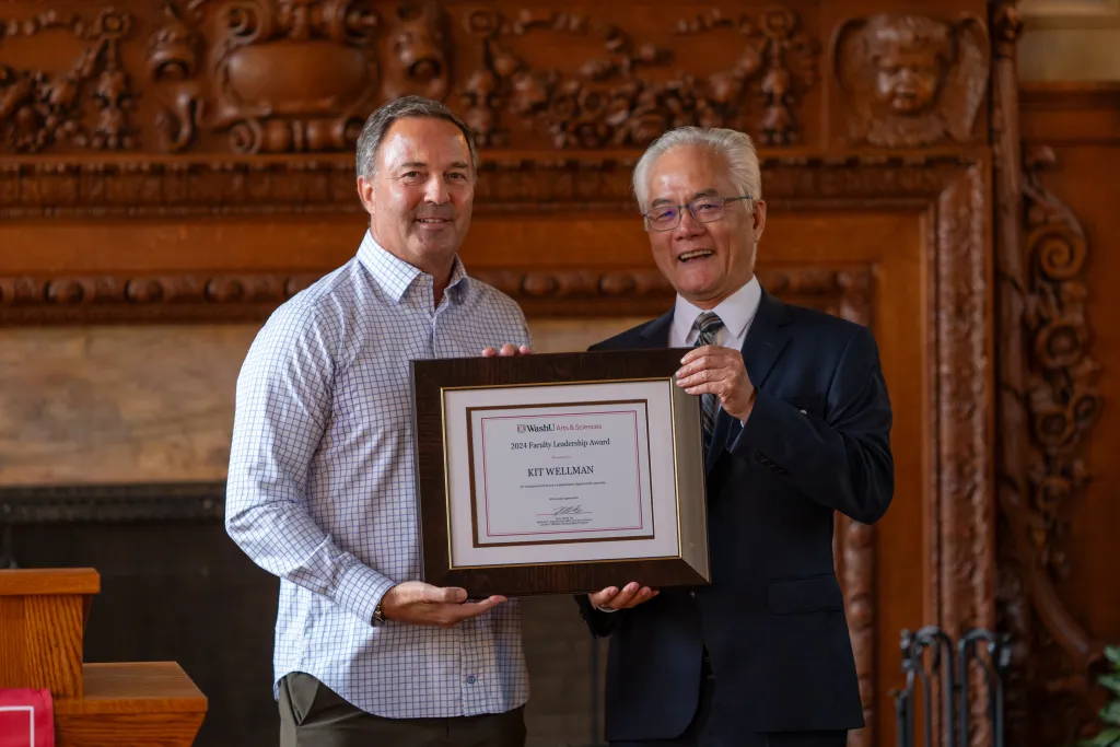 Kit Wellman accepts the Faculty Leadership Award from Feng Sheng Hu, the Richard G. Engelsmann Dean of Arts & Sciences.