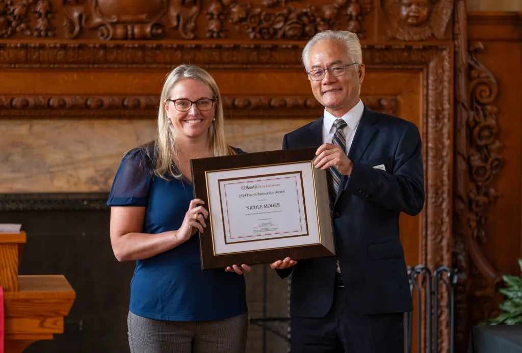 Nicole Moore accepts the Dean's Strategic Partnership Award from Feng Sheng Hu, the Richard G. Engelsmann Dean of Arts & Sciences.
