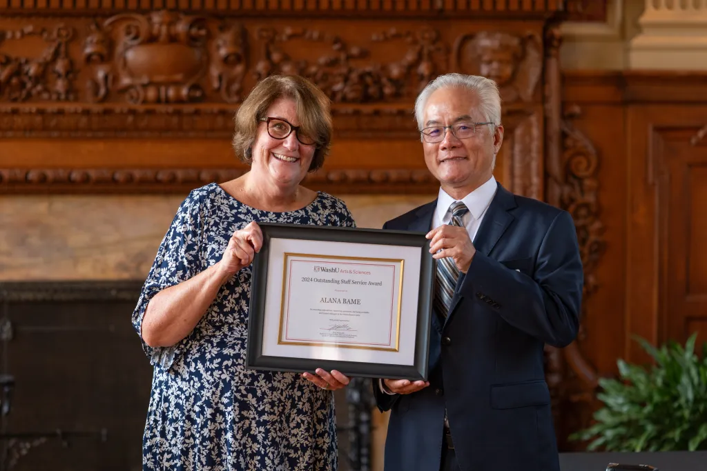 Alana Bame accepts her Staff Service Award from Feng Sheng Hu, the Richard G. Engelsmann Dean of Arts & Sciences.