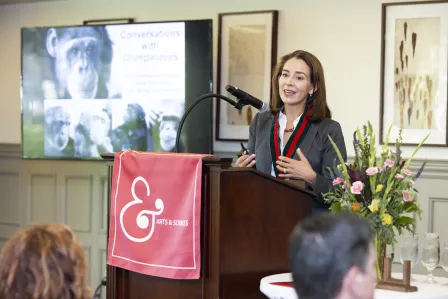 Crickette Sanz, the James W. and Jean L. Davis Professor in Arts and Sciences, delivered an address titled “Learning from Great Apes about Rank.” (Photo: Rebecca K. Clark for WashU)