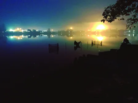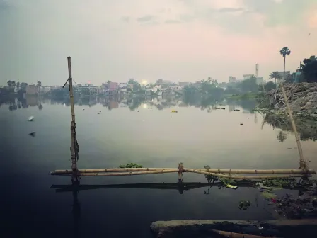 Manthan shows four men driving rafts in the Yamuna River to a floating mound of trash and debris. Their actions reference the Samudra Manthan episode in Hindu mythology, in which gods and demons briefly join together to churn an ocean and create the nectar of immortality. As a byproduct, they pollute the ocean with a poison that threatens to destroy all of existence. Another god, Shiva, swallows the poison to prevent the destruction.