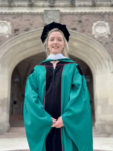 At WashU she found supportive mentors and classmates, including two friends who will be bridesmaids in her wedding soon after graduation. She also had opportunities to travel internationally, speak at conferences, and publish cutting-edge research. All of these experiences helped her forge her own path and develop a deeper sense of self. “I learned how to use my voice, value integrity, and stand up for things I believe in,” she said. “That feels hard-earned, and it makes me feel really proud of where I'm going next.”