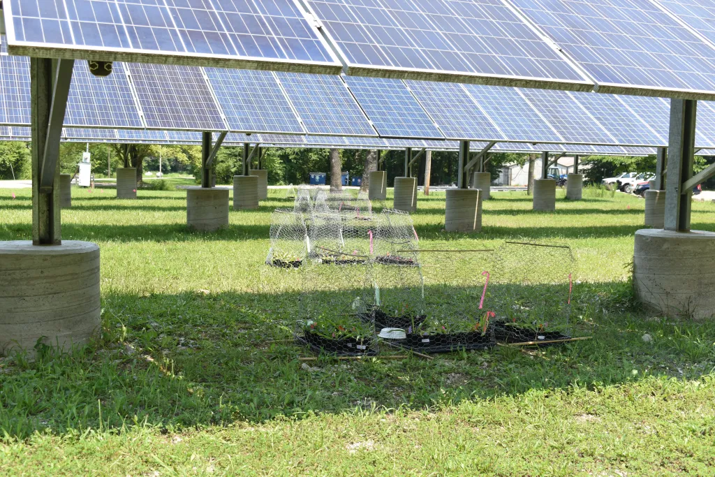 At any given location, mildew did best in places where trees or buildings provided a bit of shade. This observation was backed up by experiments that made use of solar array panels at Tyson Research Center. Potted plants placed in the shade of the panels had more mildew than those exposed to full sun.