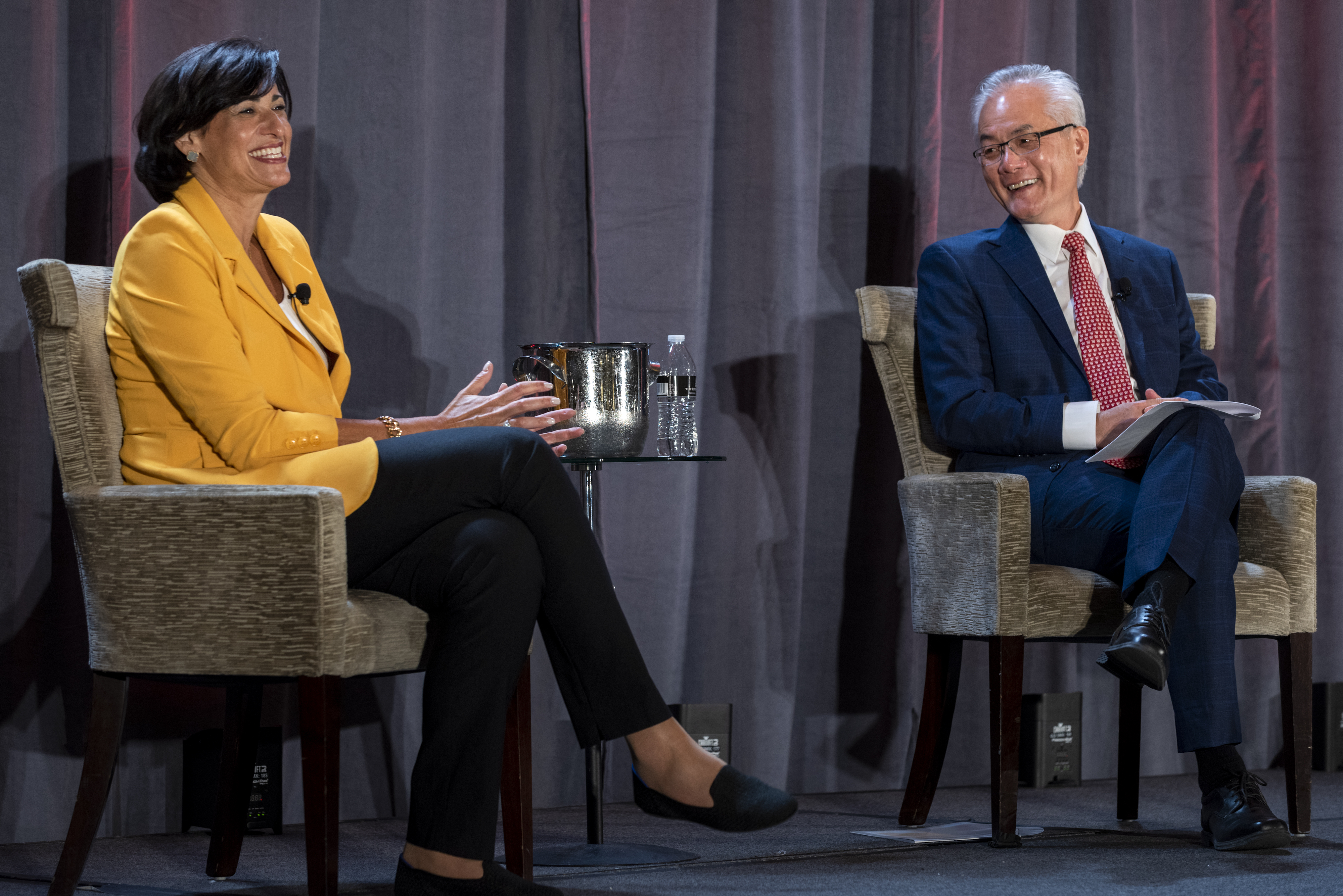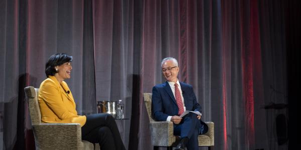 Rochelle P. Walensky (left) in conversation with Dean Feng Sheng Hu