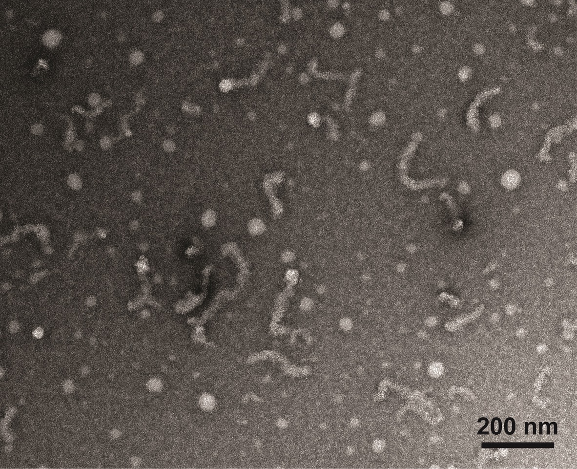 Electron microscopy of spherical and wormlike Matrin-3 assemblies. (Image courtesy of Meredith Jackrel)