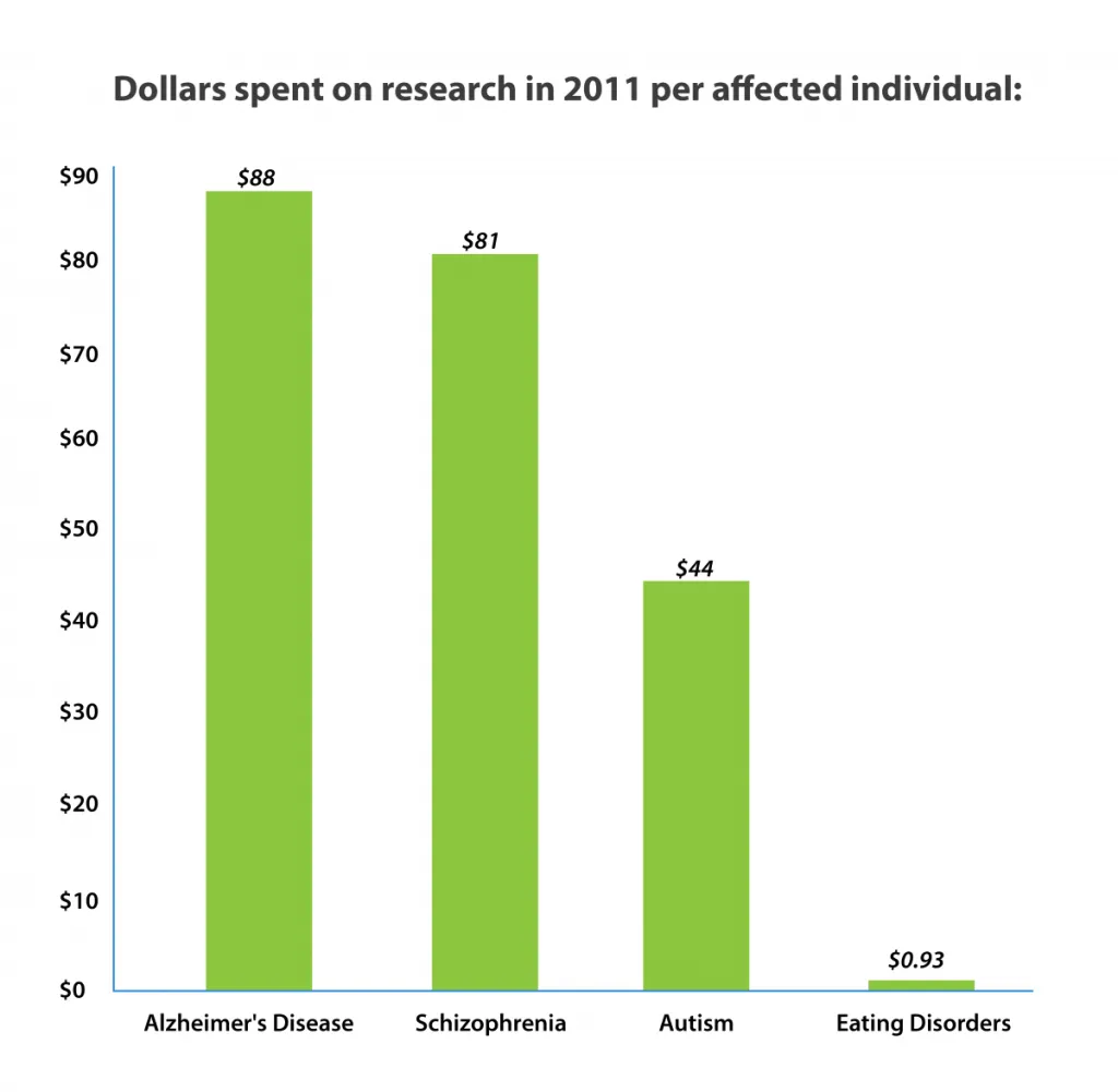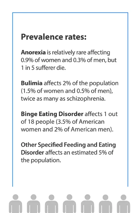 - Eating disorders affect an estimated 1 out of 7 people, making them more than five times as common as autism and more than ten times as common as schizophrenia.