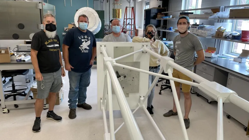 After completing XL-Calibur’s assembly on the first floor of Crow Hall, Lisalda and West packed the telescope off to NASA’s Wallops Flight Facility in Virginia on Monday, Sept. 6. From there, the telescope will be fitted with a pointing system to allow researchers to aim the entire apparatus at a black hole. Using the system’s star tracker, XL-Calibur can be pointed with an accuracy of one arcsecond, a tiny fraction of a degree equivalent to about 30 meters. At Wallops, XL-Calibur will also be loaded into a gondola that can be suspended under a balloon for flight.