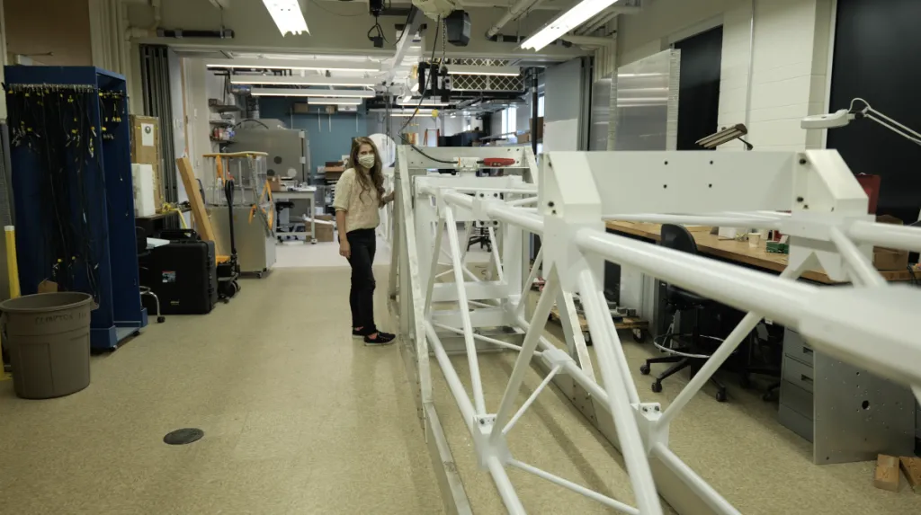Lisalda collaborated with mechanical engineer Victor Guarino on the design of the optical bench, carefully crafting the carbon fiber and aluminum truss and its joints to be strong enough to withstand forces up to 16 times the force of Earth's gravity. The optical bench was fabricated in the machine shop at Washington University by Todd Hardt, Kenny Schmidt, and Dennis Huelsman.