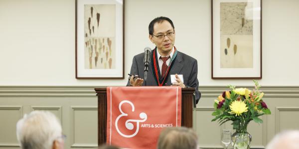 On Nov. 7, Li Yang was installed as the Albert Gordon Hill Professor of Physics. The program included a welcome from Feng Sheng Hu, the Richard G. Engelsmann Dean of Arts & Sciences and Lucille P. Markey Distinguished Professor; an introduction by Henric Krawczynski, the Wilfred R. and Ann Lee Konneker Distinguished Professor of Physics; and the installation and medallion presentation by Dean Hu.
