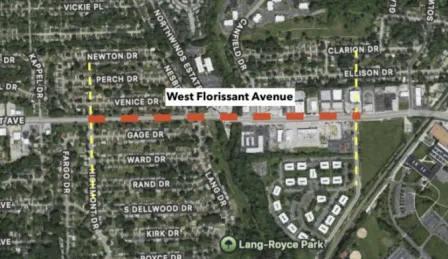 A team of students participating in the “Sustainability Exchange” worked with community stakeholders to propose infrastructure recommendations for a section on West Florissant Avenue, as shown in red.